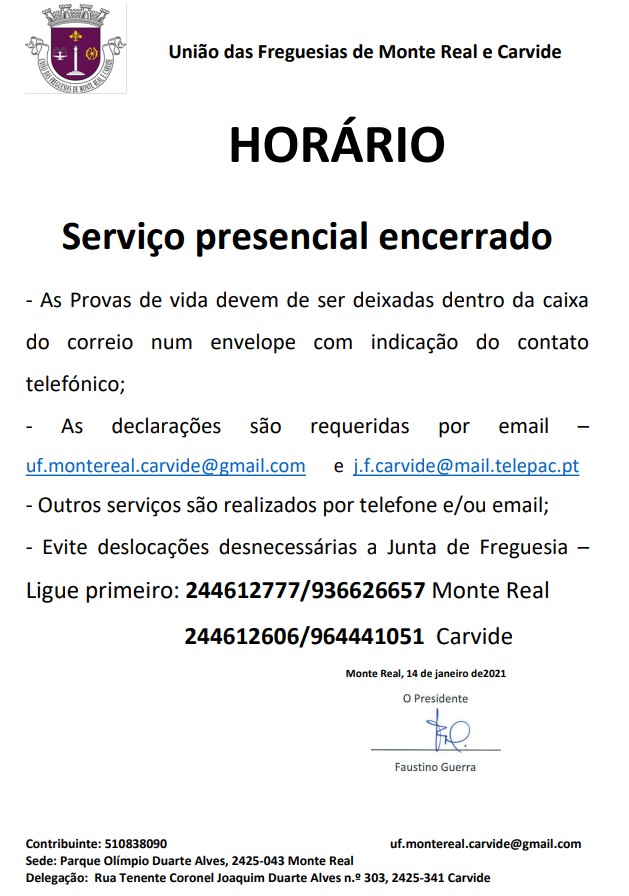Informação - Horário - Serviço presencial encerrado