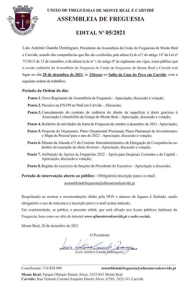 Edital n.º 5/2021 - Assembleia de Freguesia